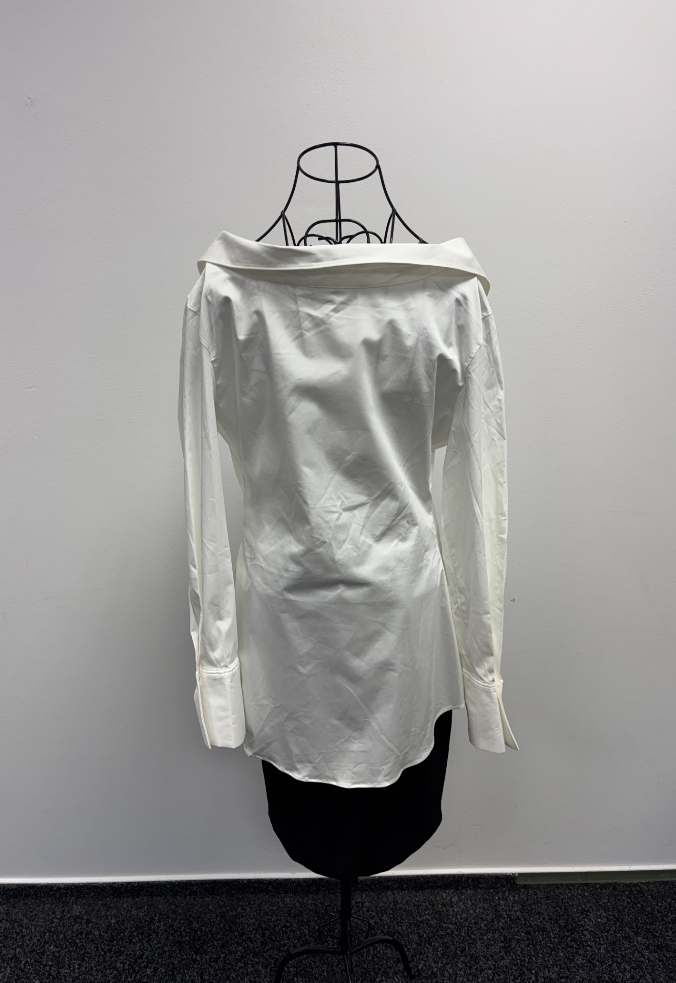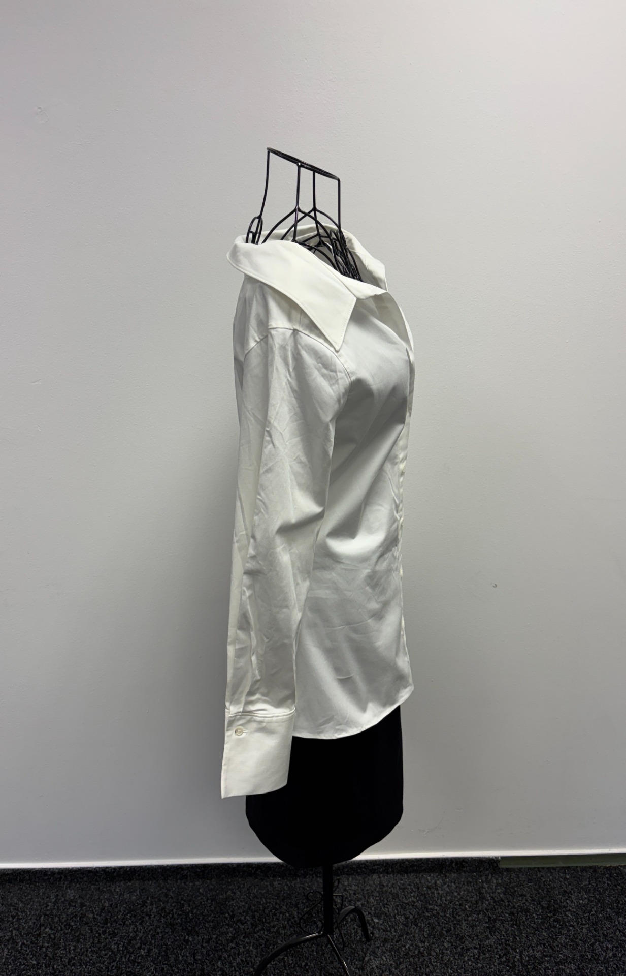 Tento oděv je charakteristický svým klasickým límečkem, zapínáním na knoflíky a dlouhými rukávy s manžetami. Na obrázku jsou zobrazeny v kombinaci s černou spodní sukní nebo šaty, což vytváří elegantní a kontrastní vzhled.