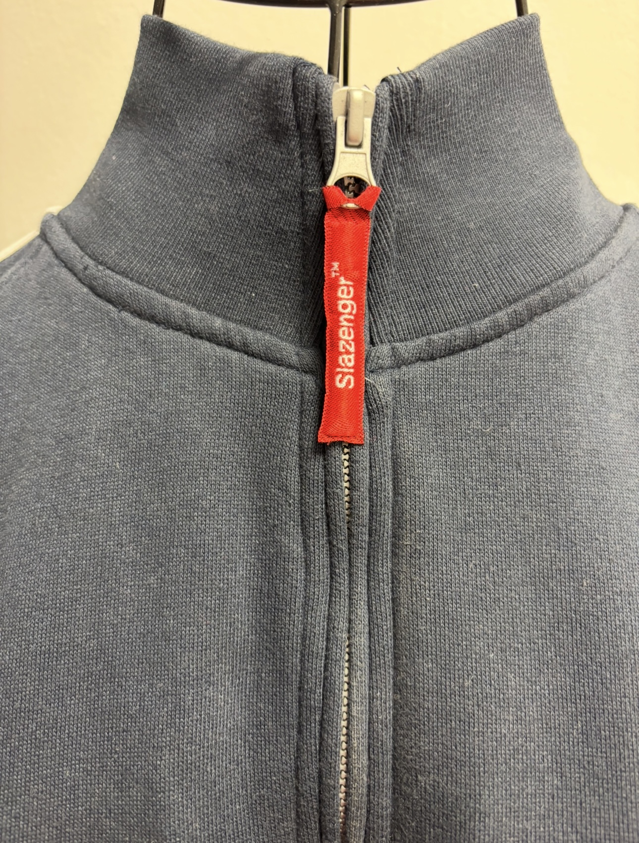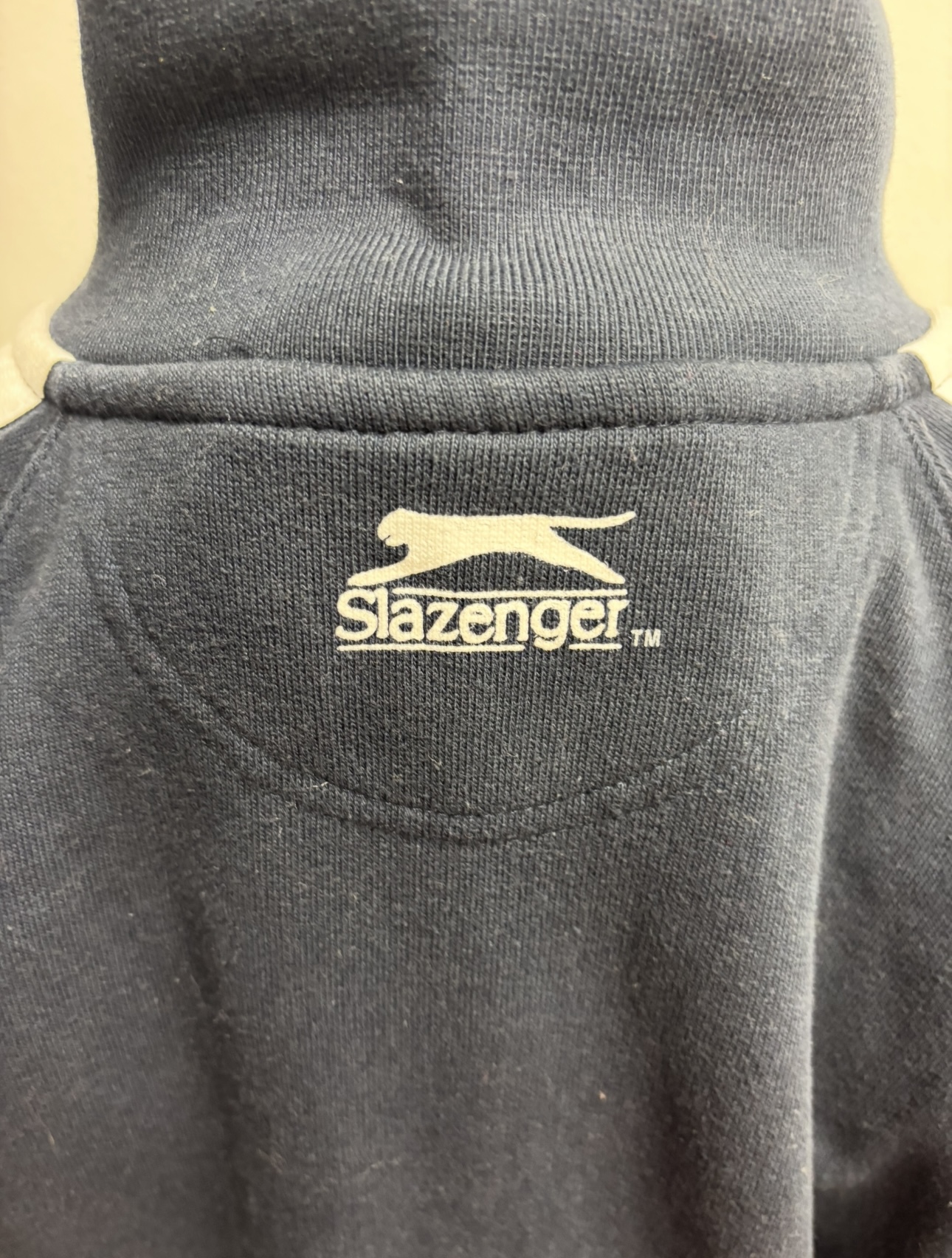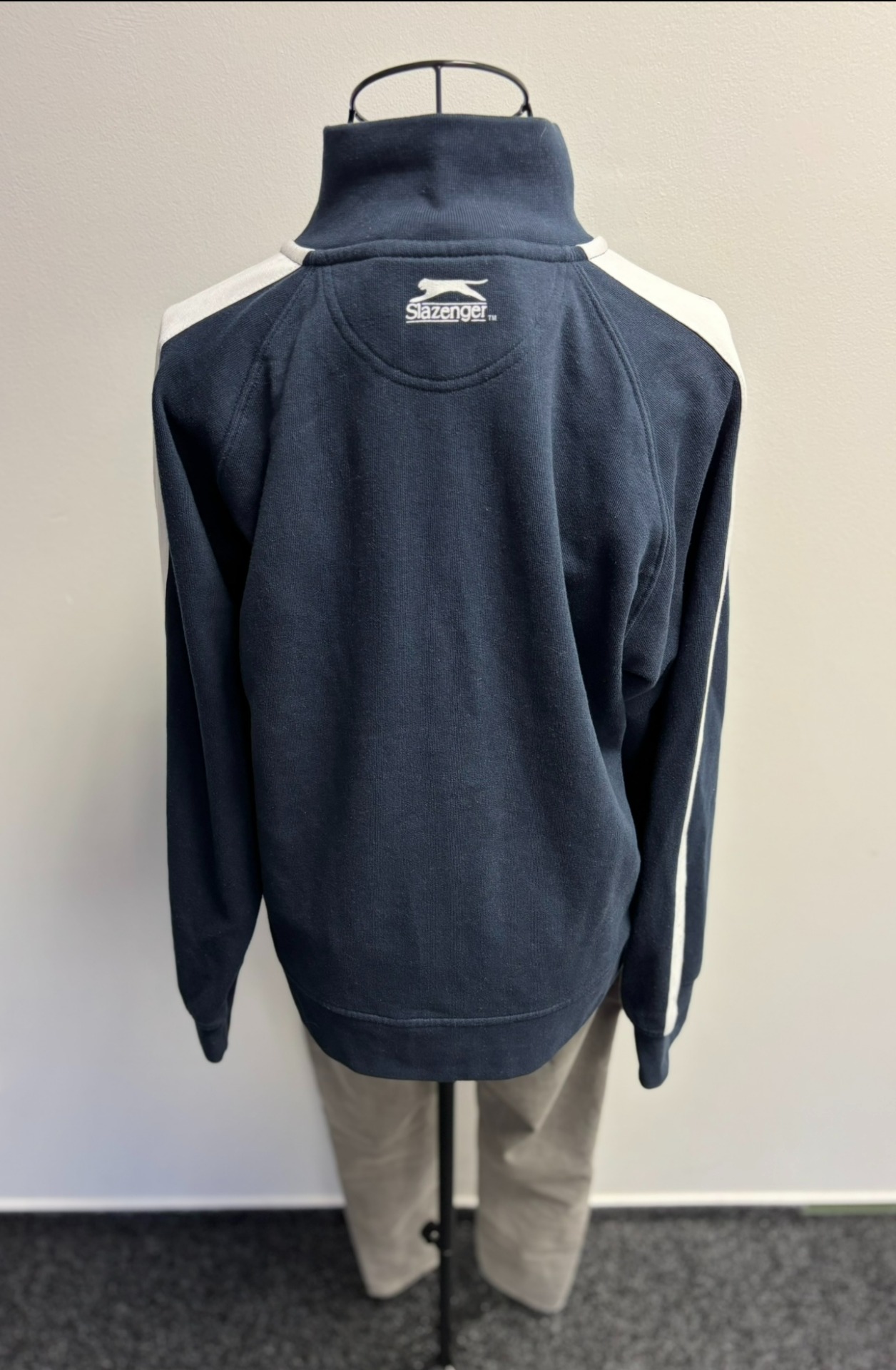 Tmavě modrá mikina (Unisex) s bílými pruhy na rukávech. Tréninková bunda nebo může být součástí teplákové soupravy. Bunda je na zip, tedy sportovní bunda. Vhodná na sport, golf nebo běh.