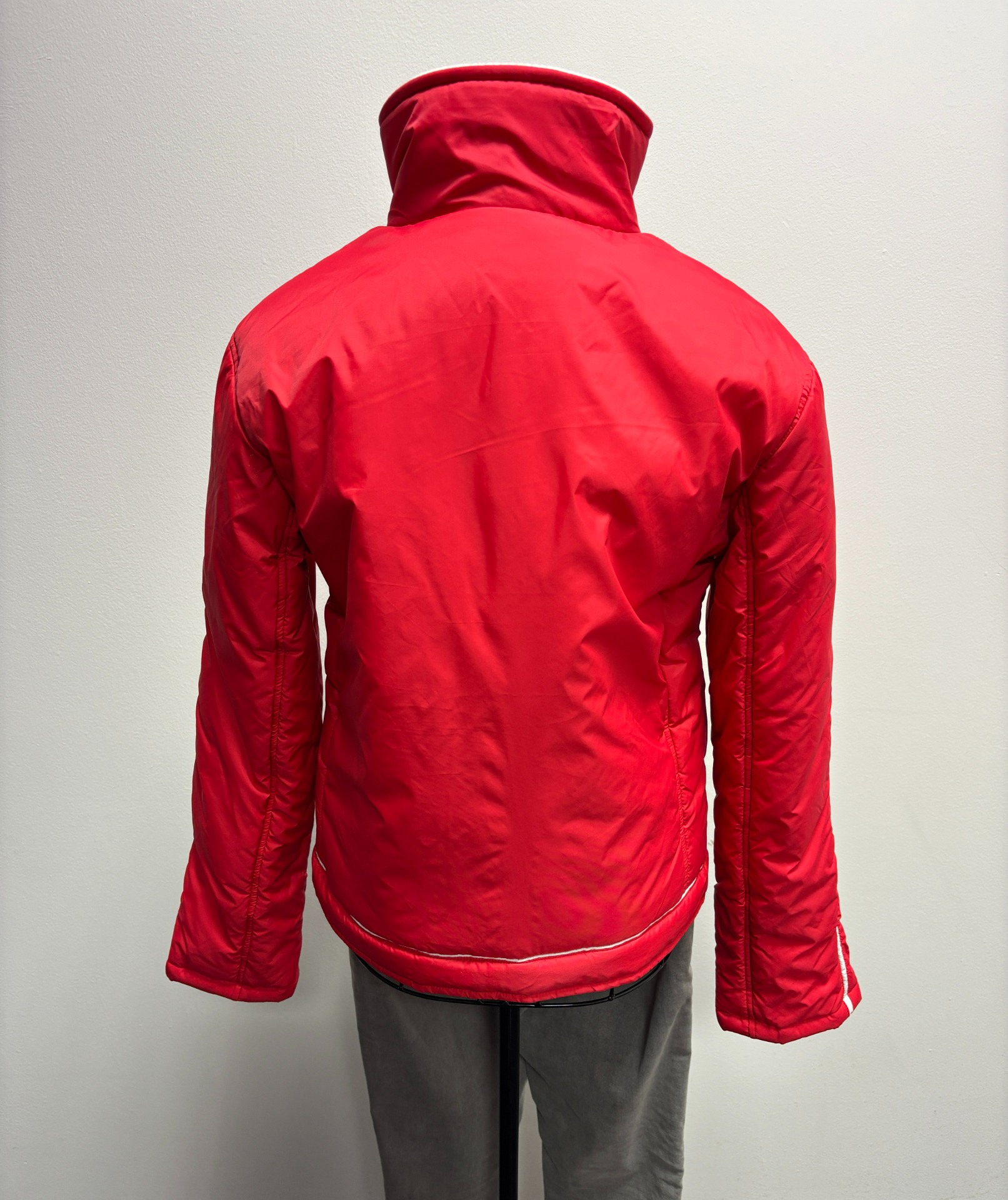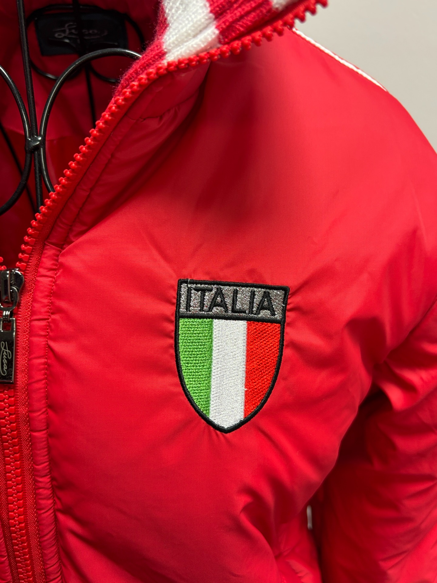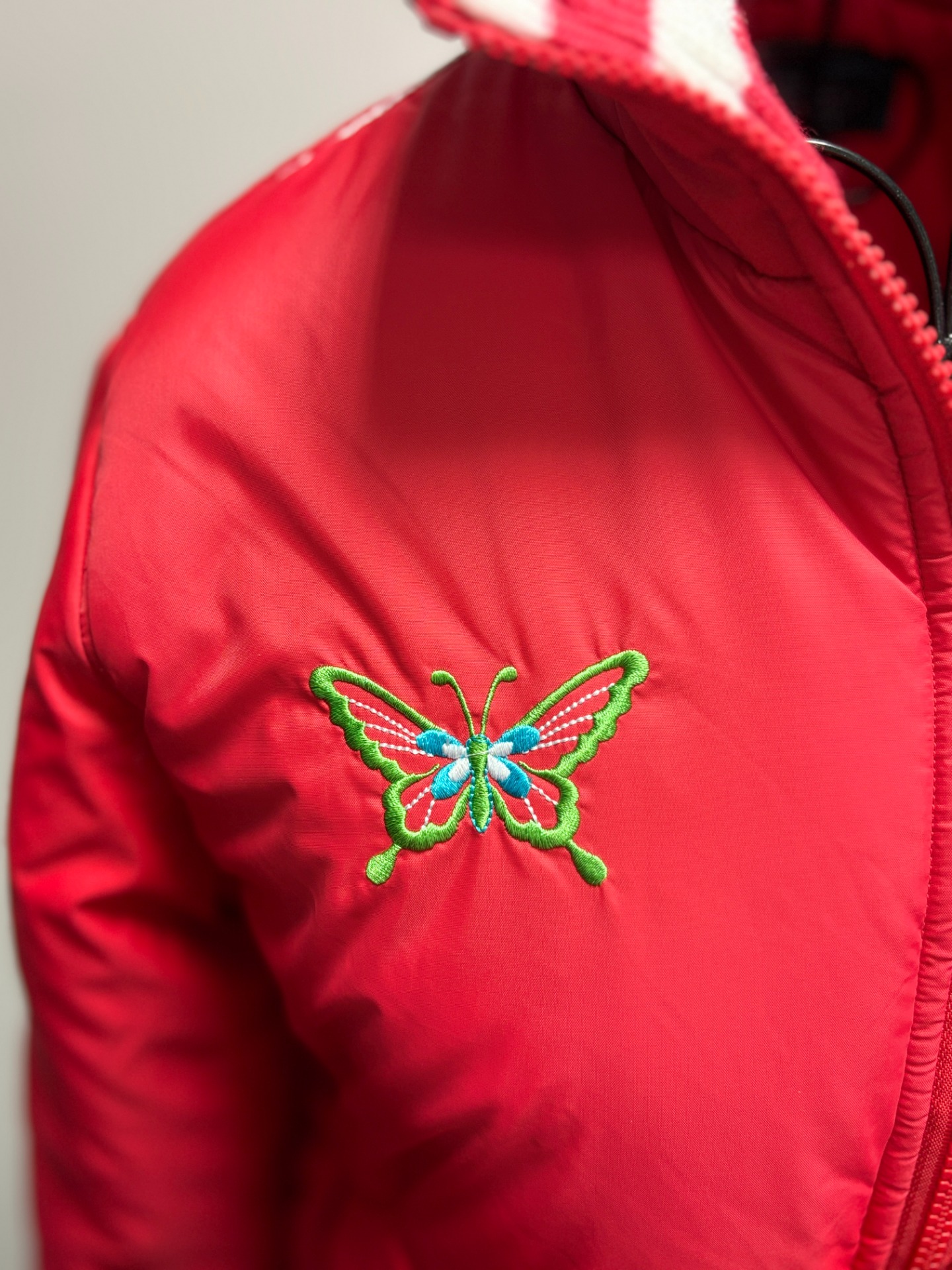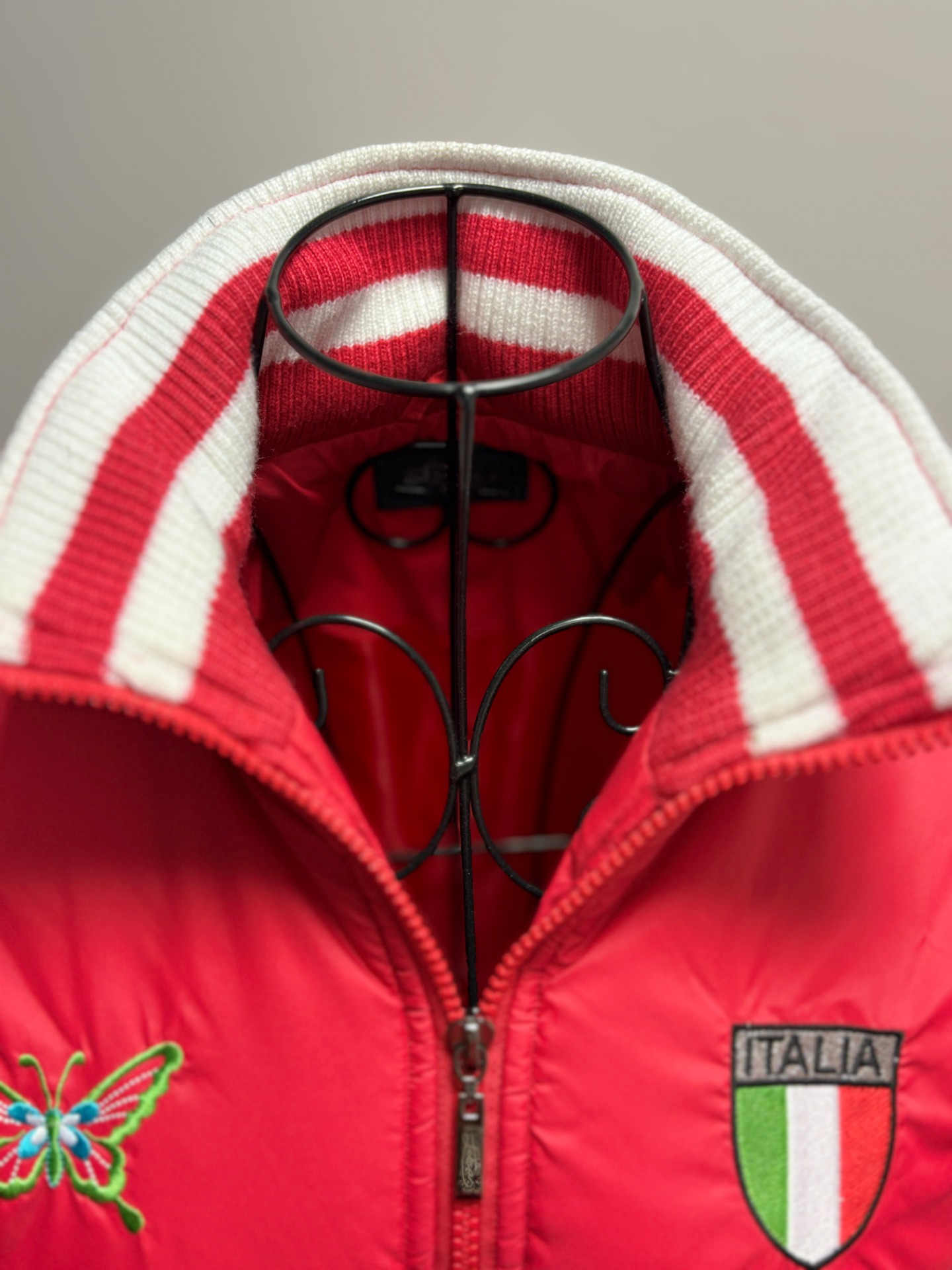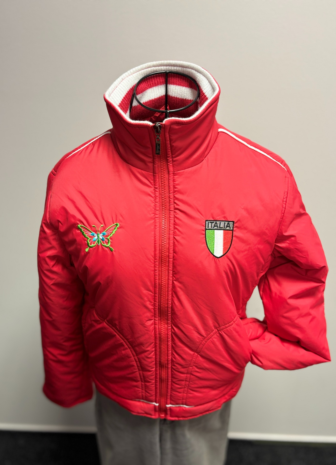 Bunda má na přední straně logo s italskou značkou a výšivkou motýla. Jedná se o prošívanou bunda se stojáčkem, vhodnou pro chladné počasí nebo zimní sporty, jako je lyžování.