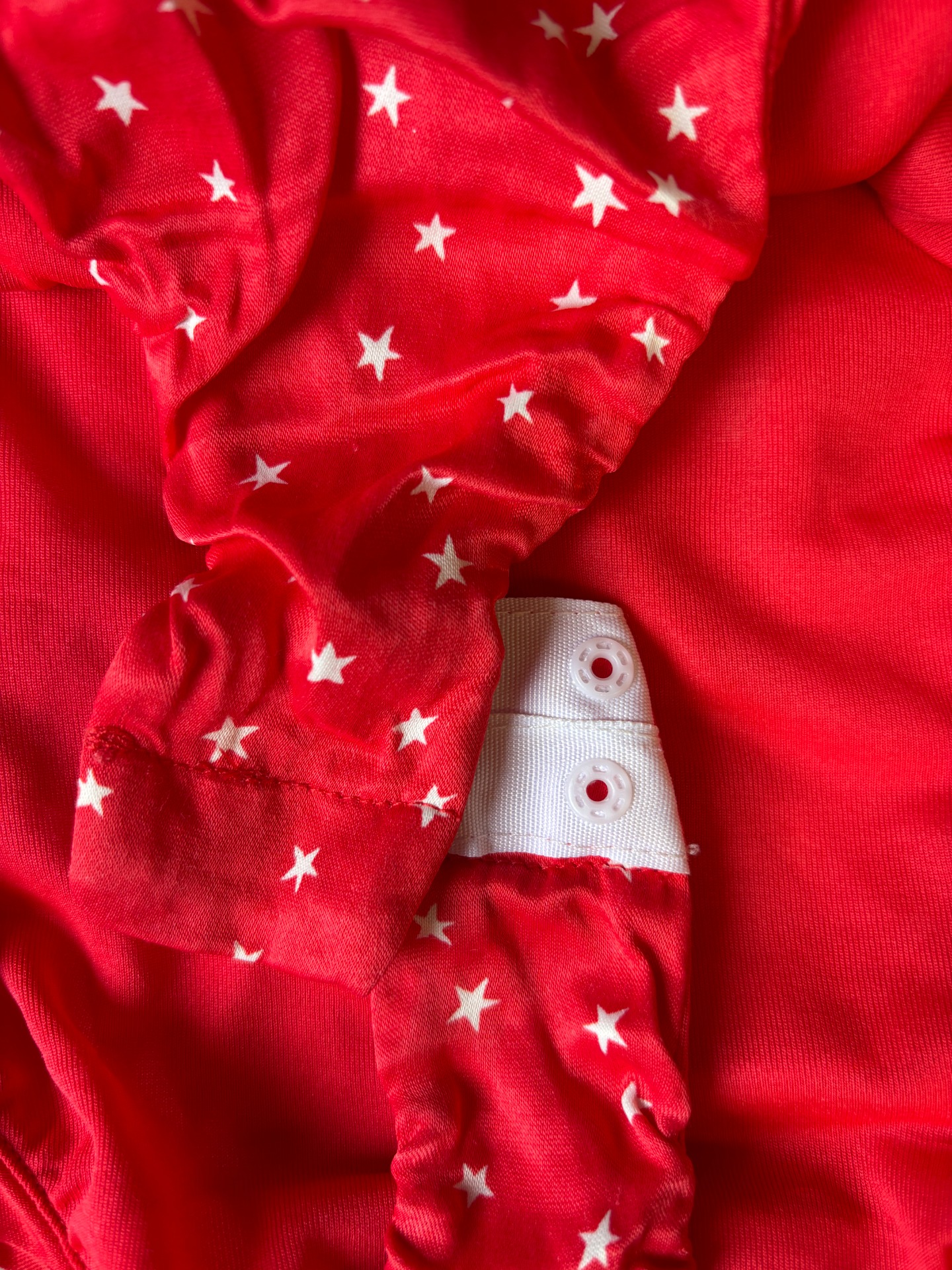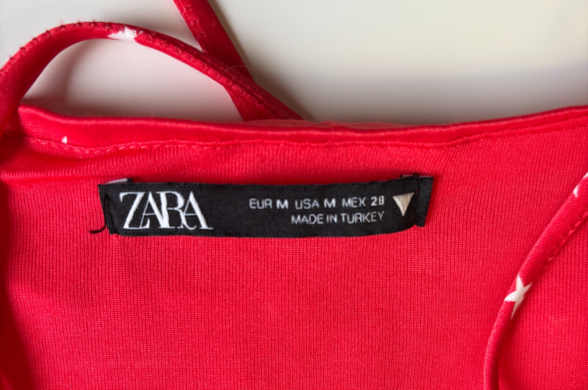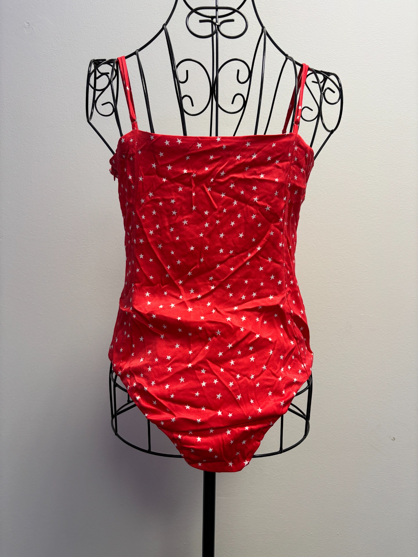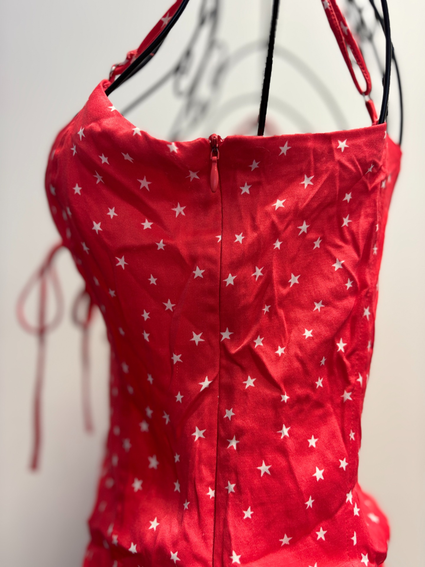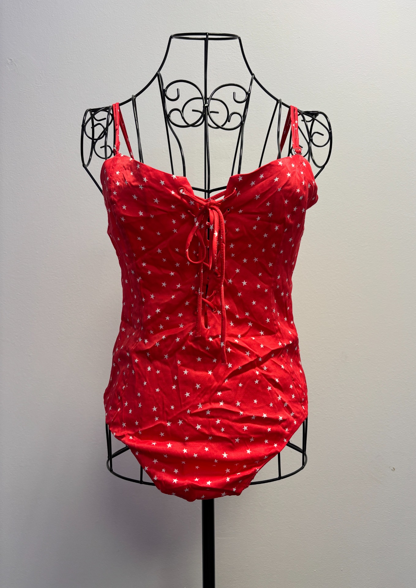 Jedná se o body Zara Satin Effect Lace Up Star Bodysuit. Toto červené body se vzorem bílých hvězd má saténový efekt, šněrování vpředu, nastavitelná tenká ramínka a zapínání na patentky v rozkroku.
