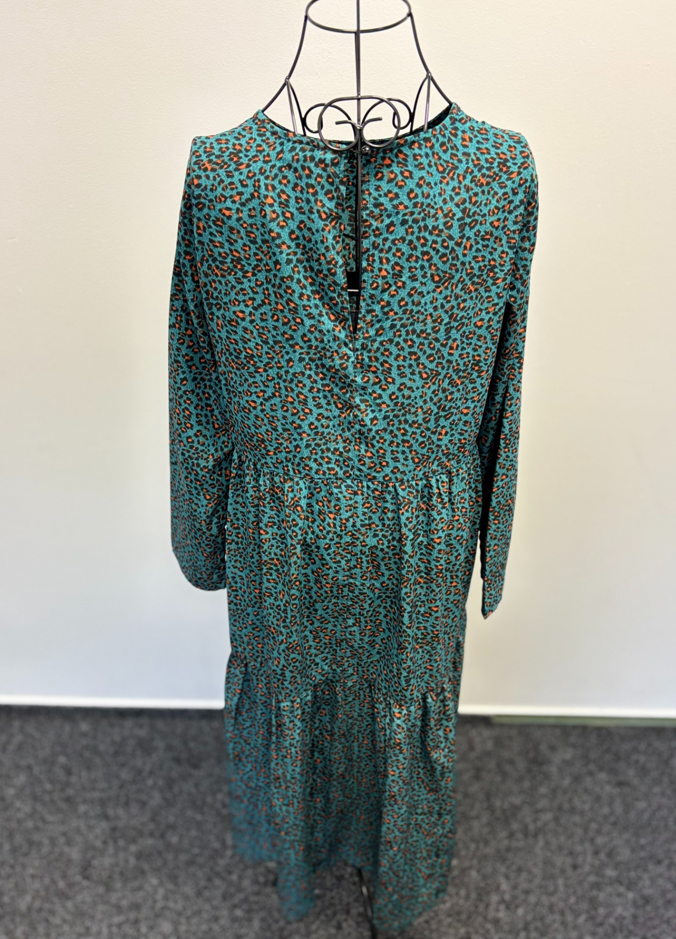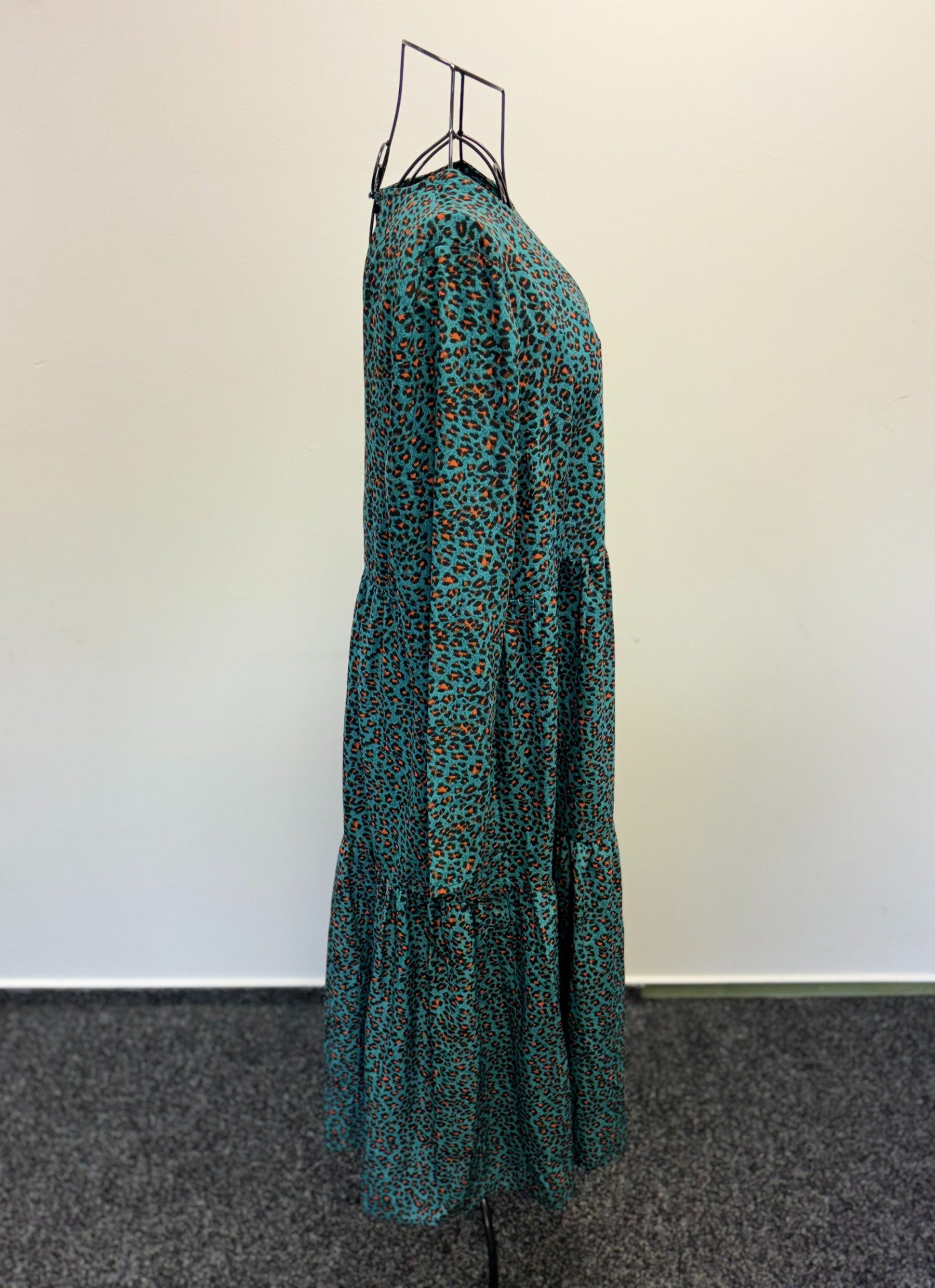 Střih je volnější, skládaný do volánů, což dodává šatům vzdušný vzhled.