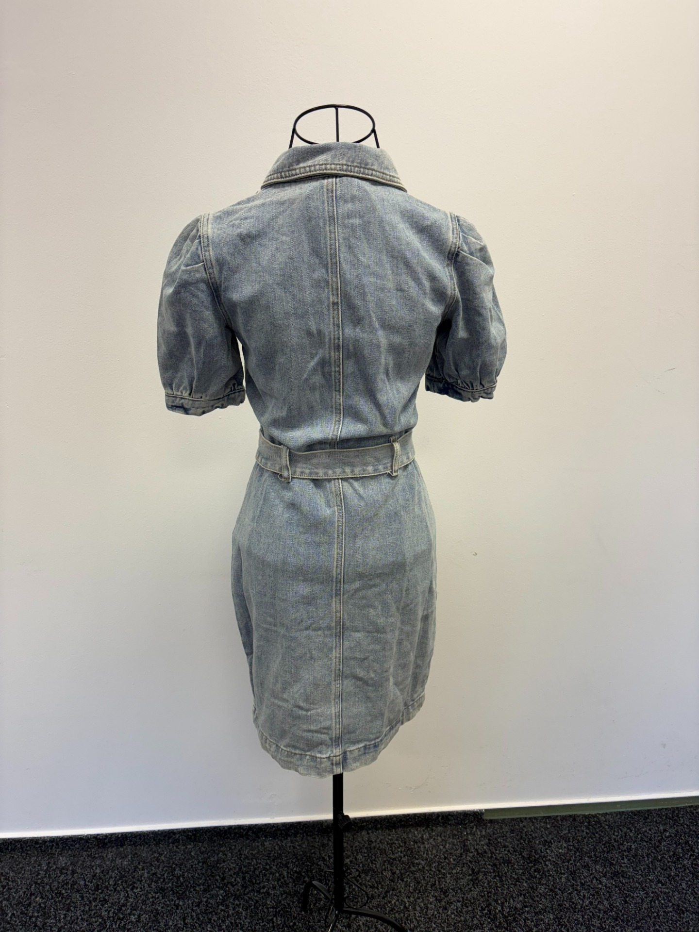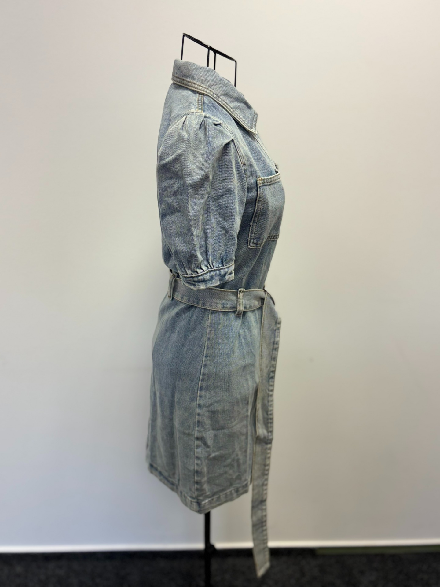 Šaty mají límeček a zapínání na knoflíky po celé délce. Jsou vyrobeny z denimu se středním odstínem modré barvy.