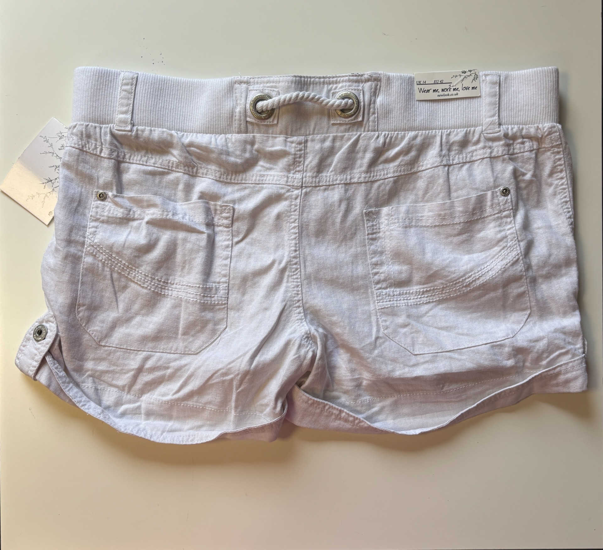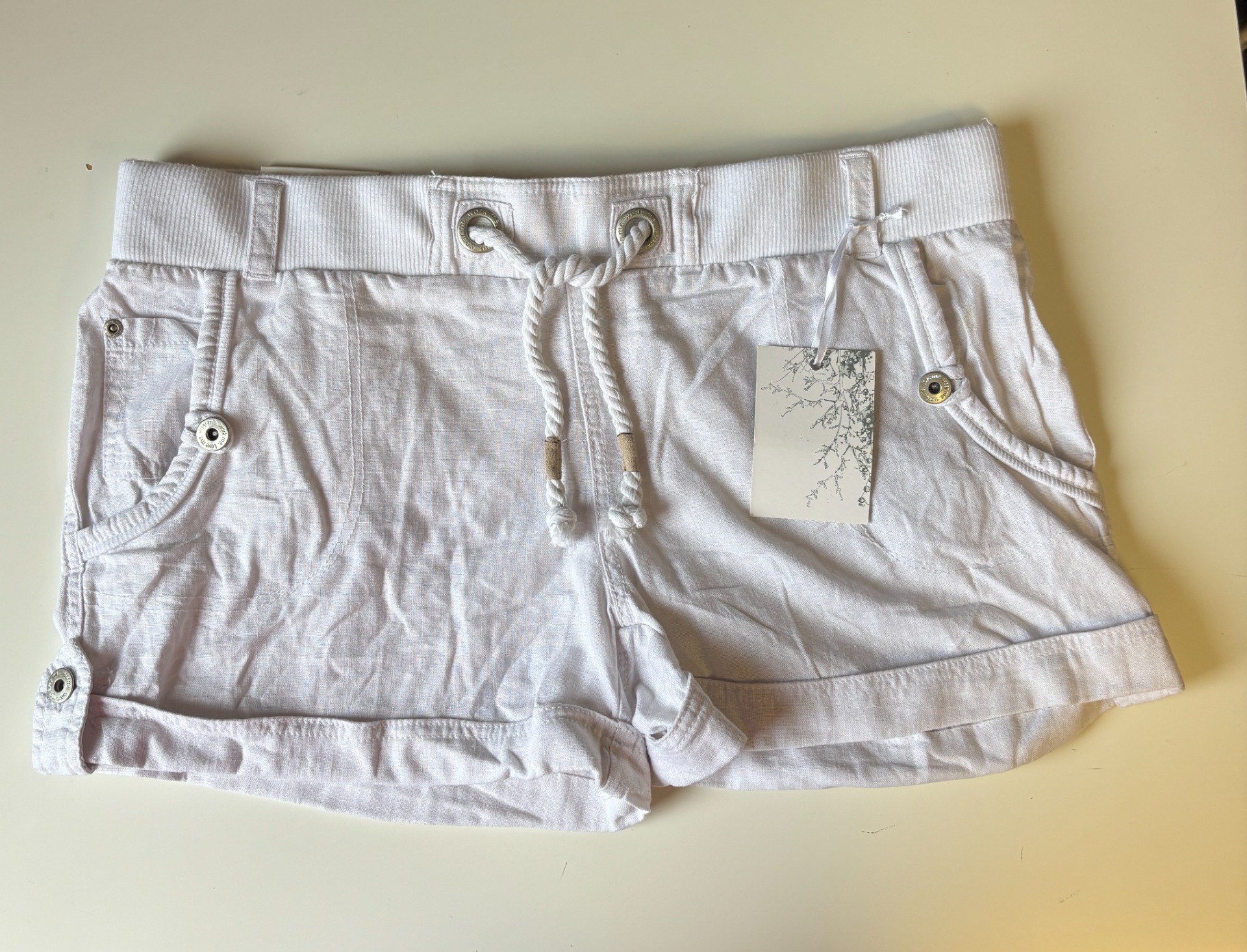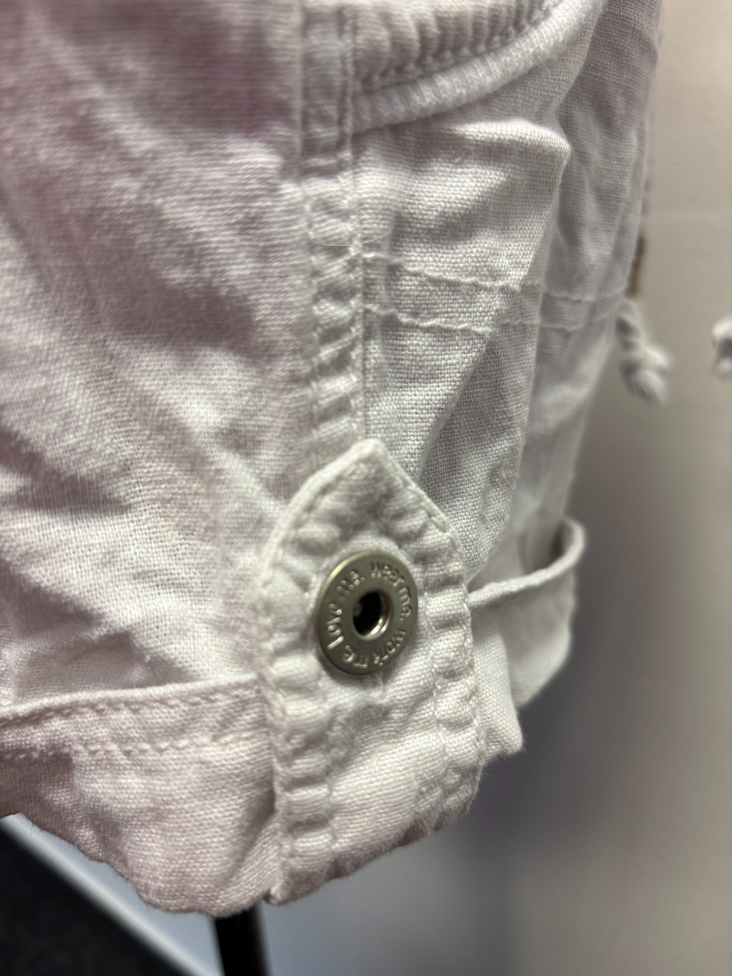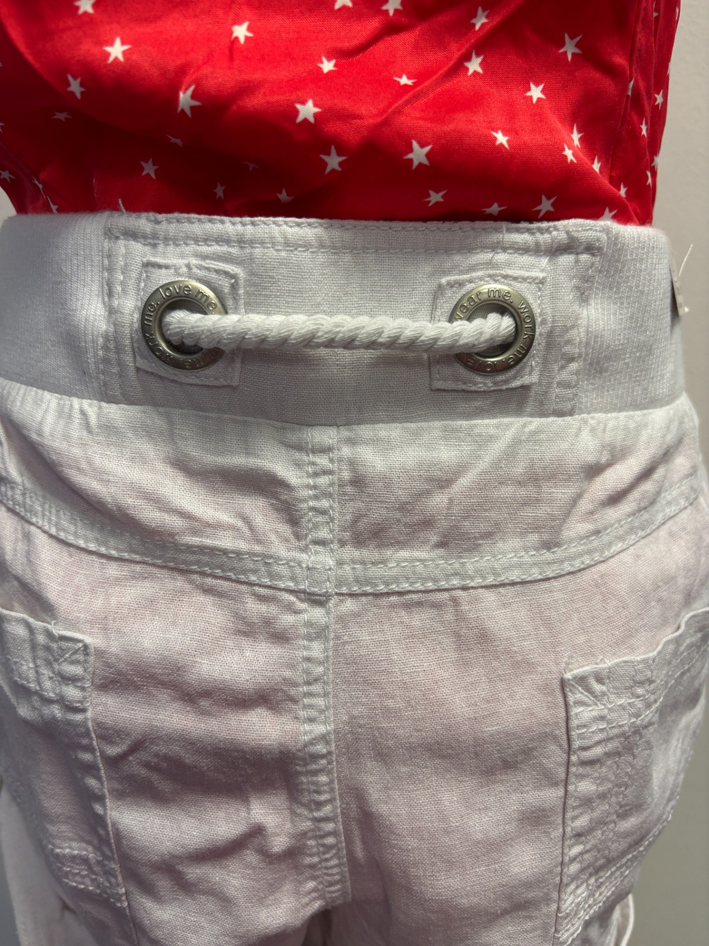 Tyto bílé šortky mají cargo styl s elastickým pasem a stahovací šňůrkou. Jsou navrženy pro ležérní a pohodlné nošení a mají četné kapsy s knoflíky na bocích a vzadu, stejně jako poutka na opasek. Lze je nosit buď s ohrnutým, nebo prodlouženým lemem.
