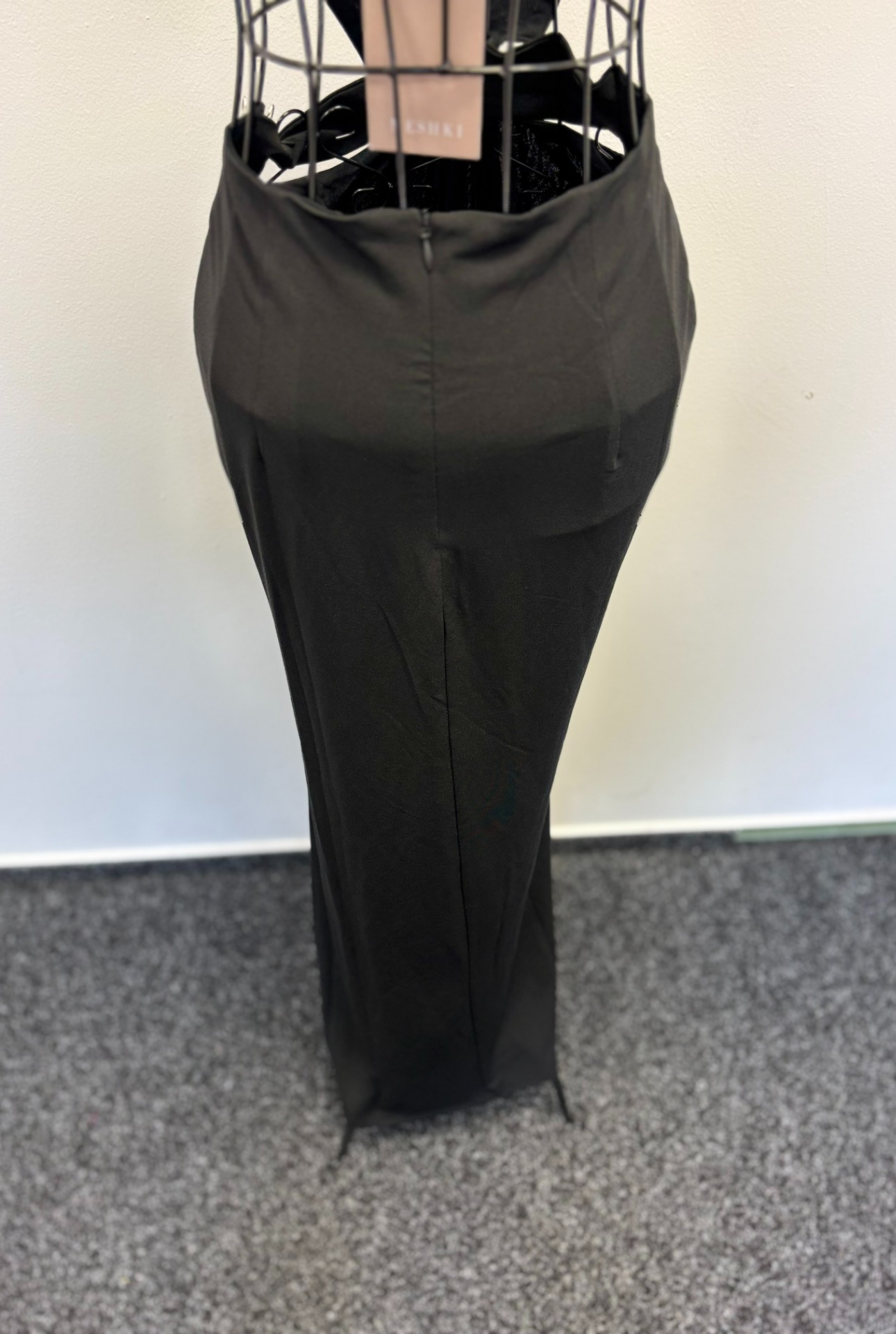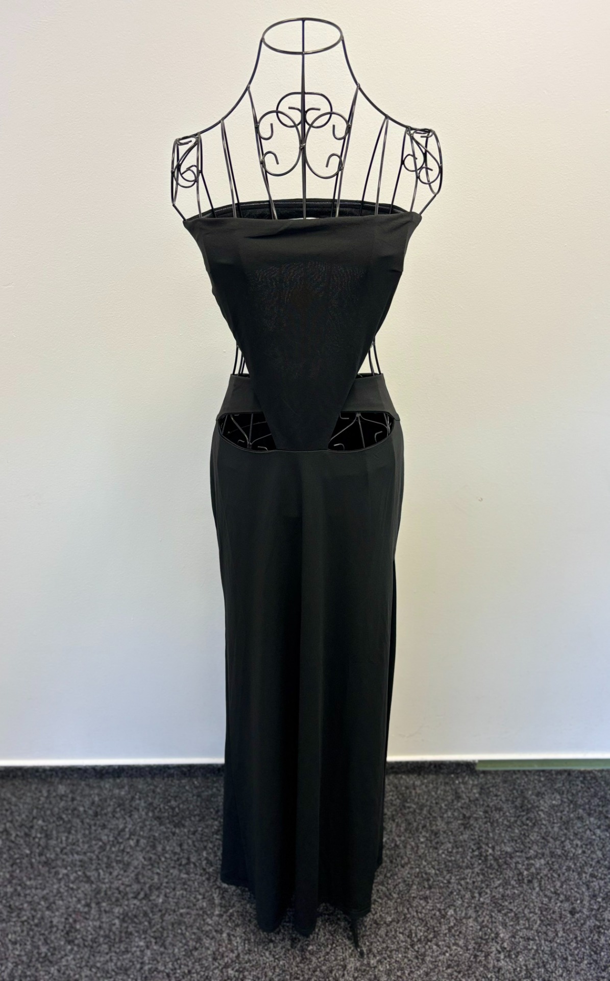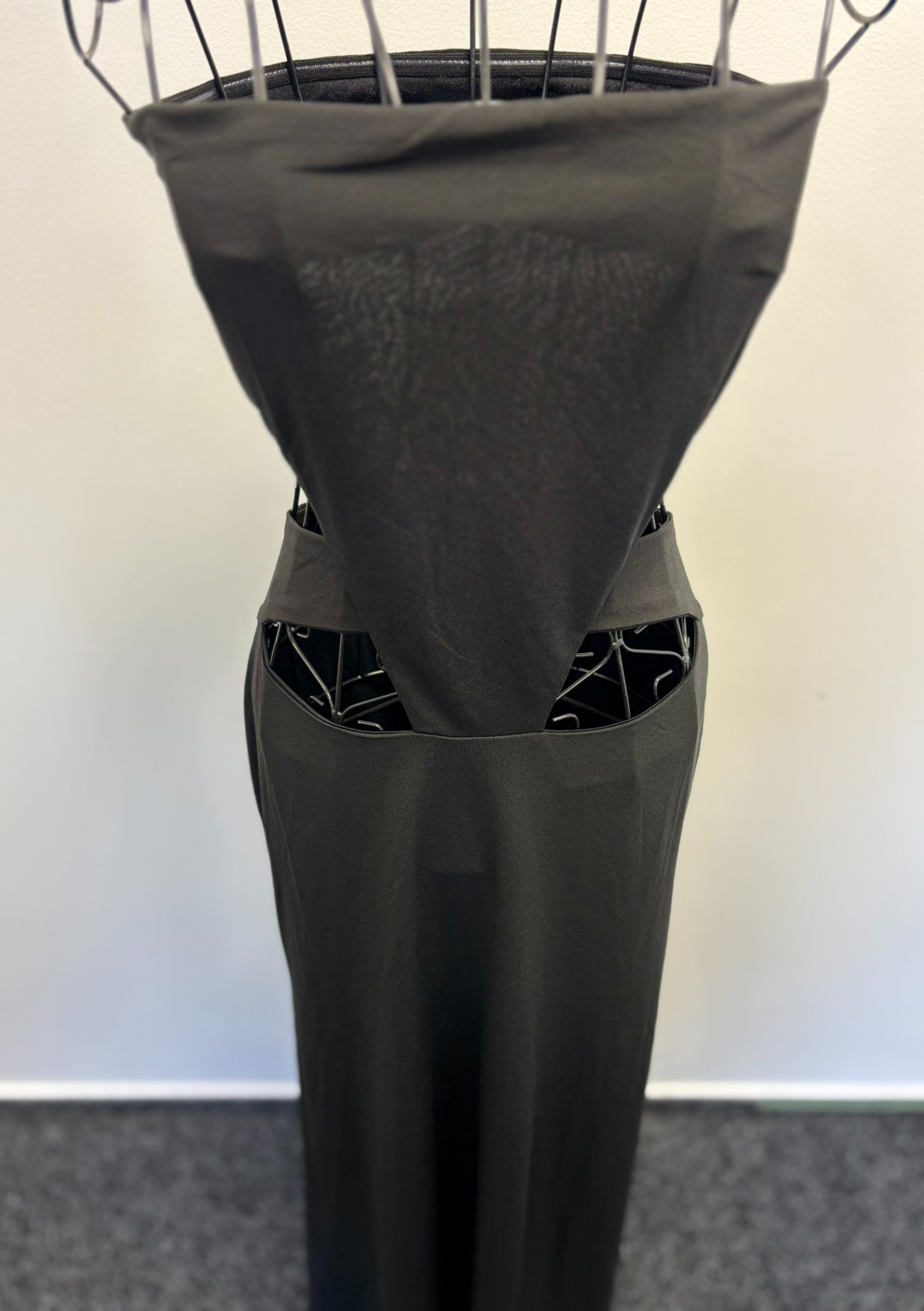 Šaty bez ramínek mají výřezy na bocích.Je to elegantní kousek, který je ideální pro večerní příležitosti nebo párty.