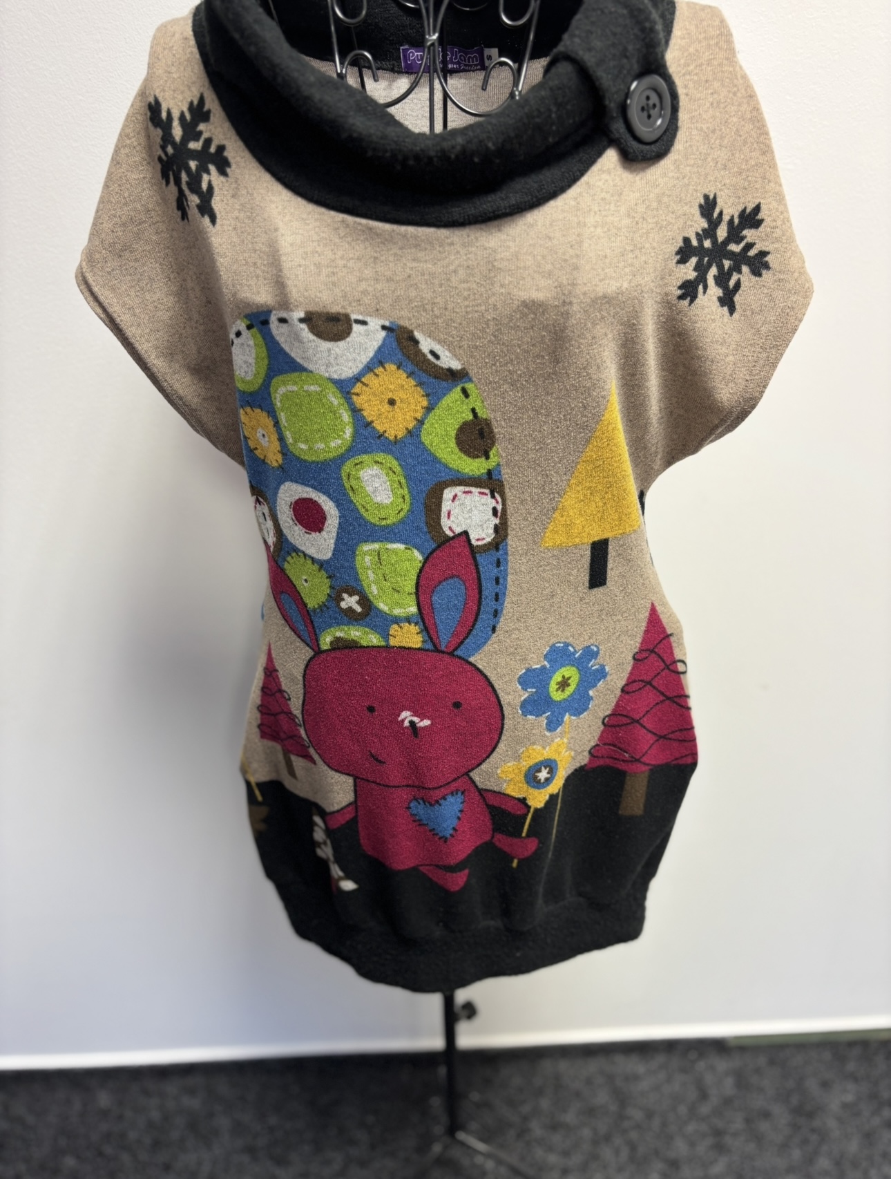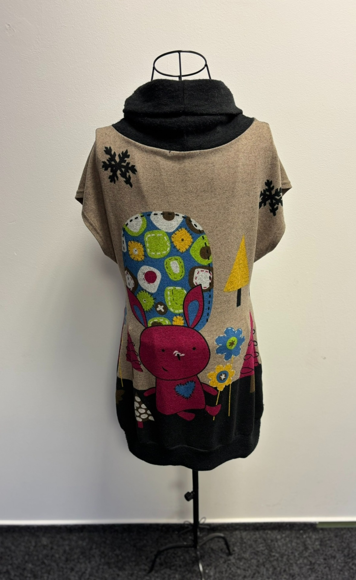 Dámské zimní šaty nebo tunika s rolákovým límcem, která je zdobená výrazným kresleným motivem králíka a zimní scenérie.
