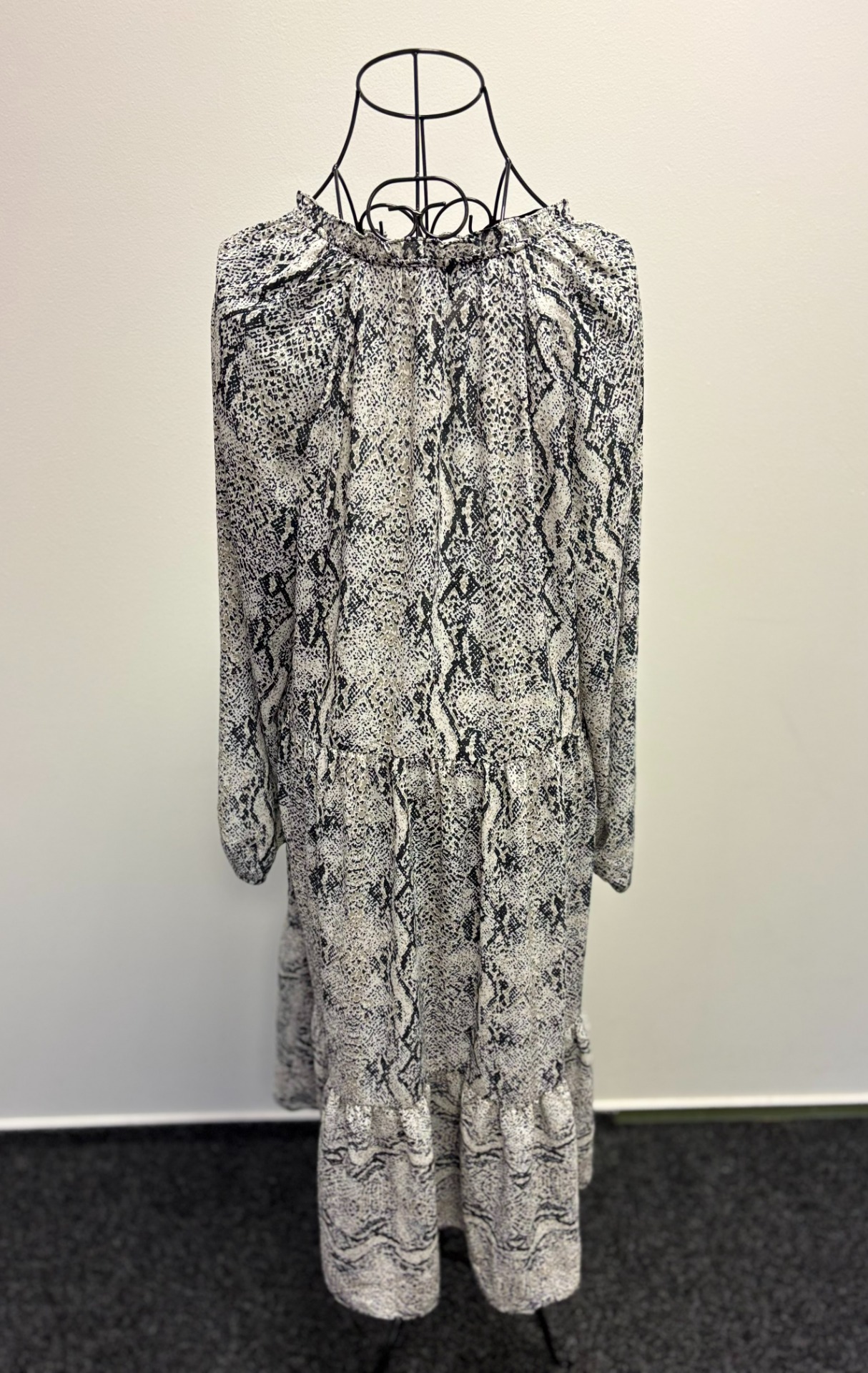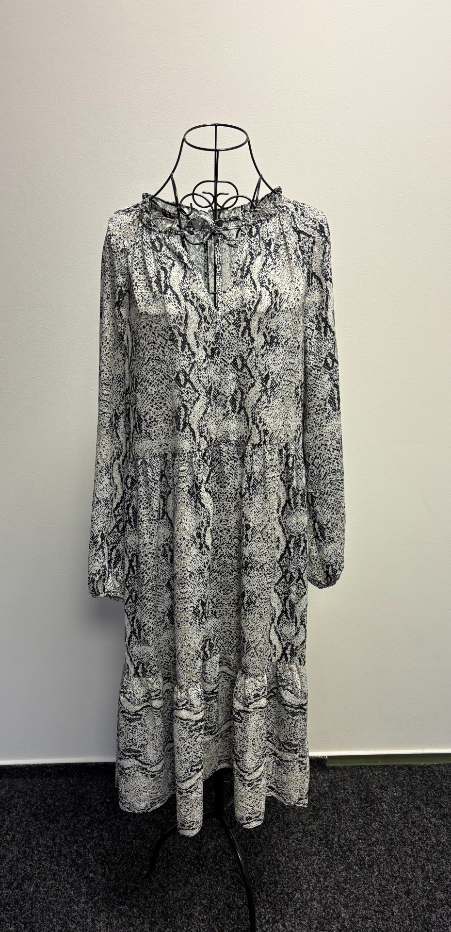 Tyto volné, stupňovité šaty s dlouhým rukávem jsou černo-šedo-bílé barvy a mají volný střih. Vysoký V-výstřih s volánkem a zavazováním na tenkou šňůrku. Na šňůrce trochu jiná barva (na fotce).