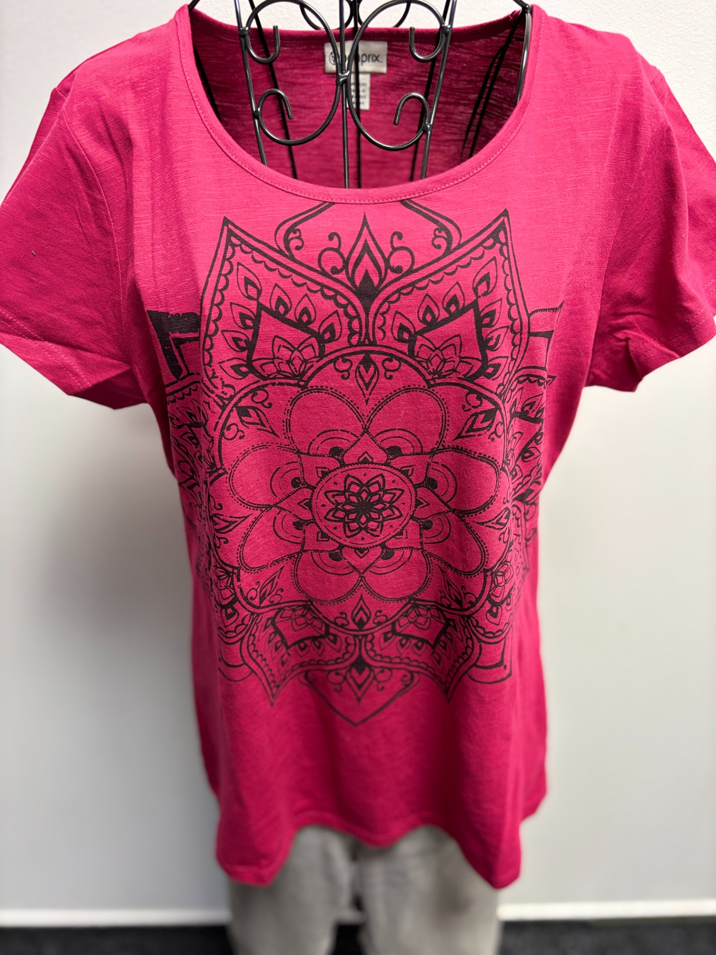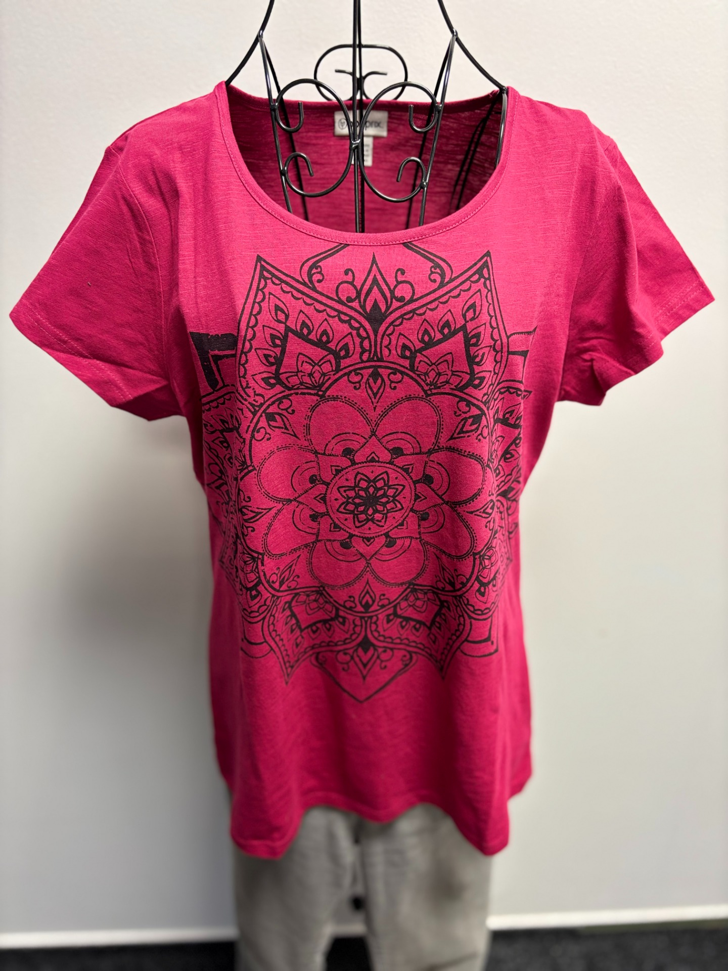 Výrazný detailní potisk mandaly uprostřed hrudi, který dodává tričku bohémský styl.