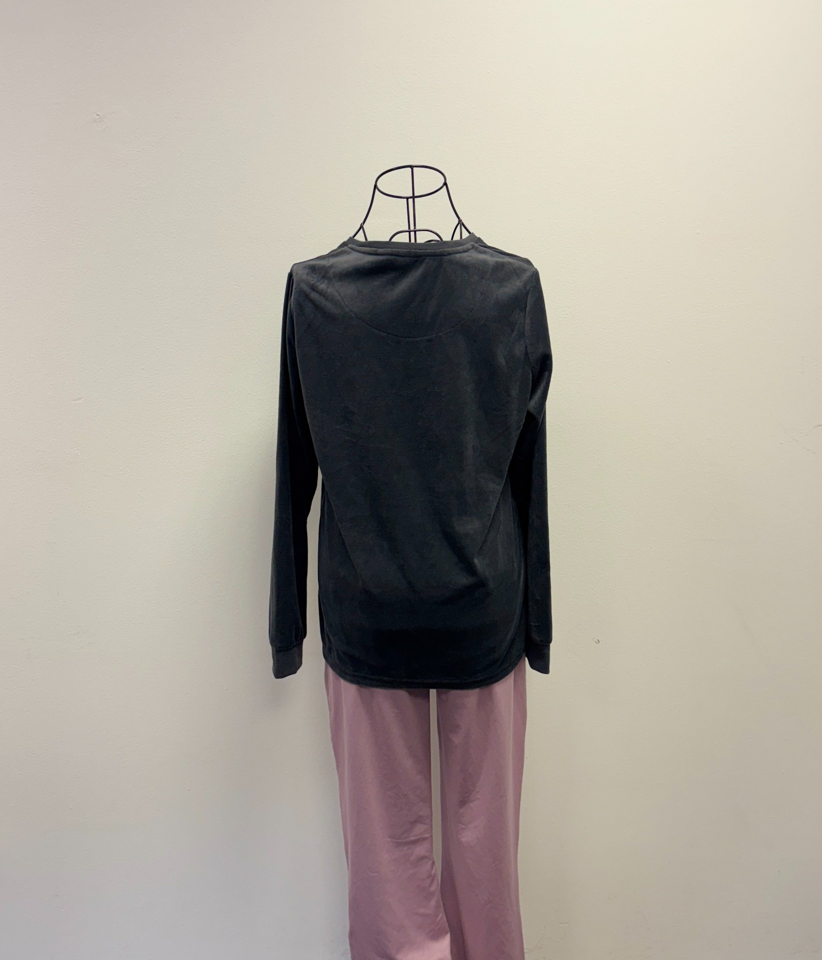 Šedé tričko s dlouhým rukávem je pyžamovým nebo loungewear kouskem s nápisem "LET'S SLEEP IN".