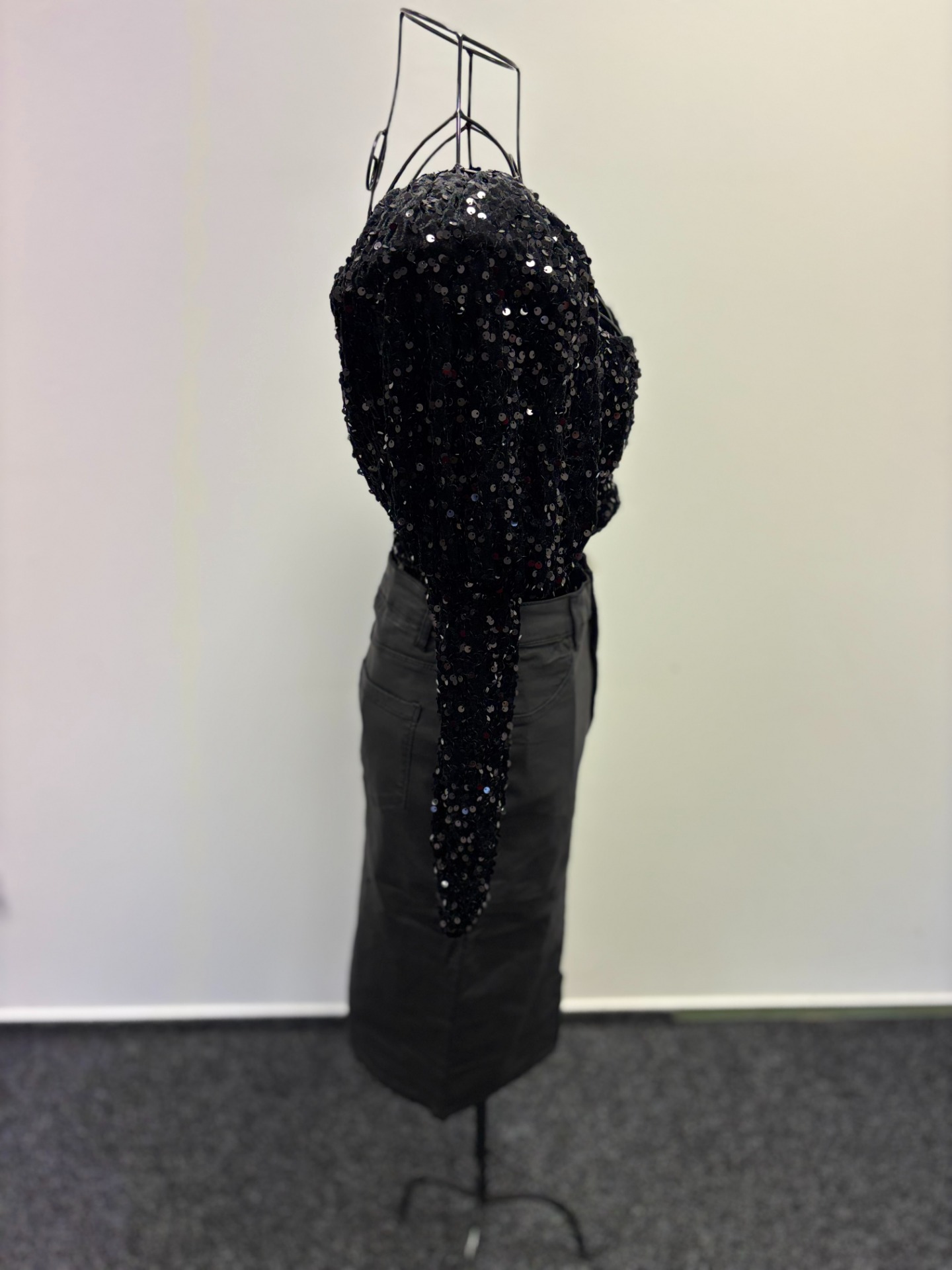 Crop top je celý pokrytý černými flitry a má výrazné nabírané dlouhé rukávy. Střih topu je rovný a končí nad pasem. Celý komplet vytváří výrazný večerní nebo party vzhled.
